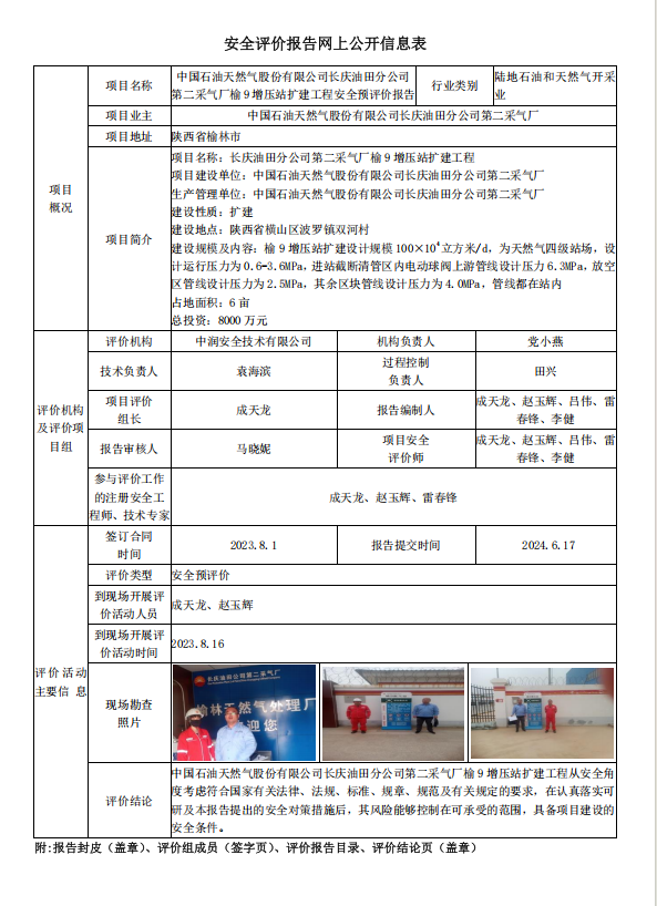 中國石油天然氣股份有限公司長慶油田分公司 第二采氣廠榆 9 增壓站擴建工程安全預評價報告